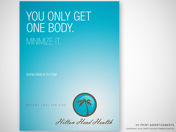 A group of different print advertisements for Hilton Head Health, targeting people looking for weight loss solutions and healthy vacations.